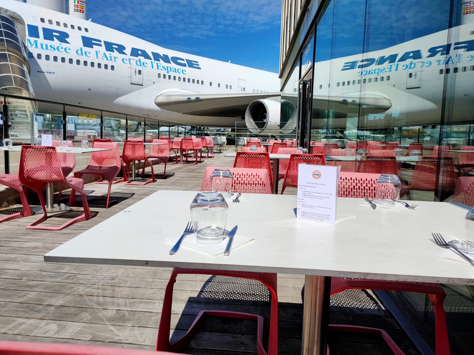Le restaurant donne directement sur le tarmac et son impressionnante fusée Ariane.